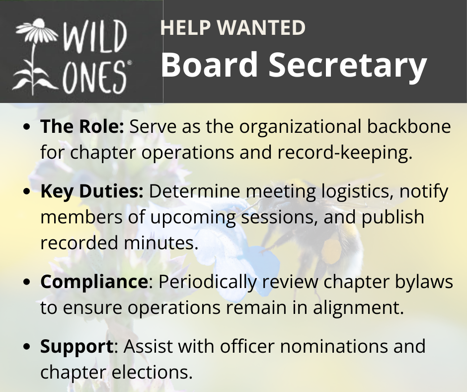 Love keeping things organized and helping a chapter run like a well-oiled machine? The Secretary plays a key role in keeping Wild Ones DFW connected and on track—setting meeting dates, times, and locations; keeping members in the loop; recording and publishing meeting minutes; maintaining chapter records; supporting officer nominations and elections; and making sure everything we do aligns with our bylaws. This is a principal officer role open to current Wild Ones DFW members, with a manageable time commitment of about one hour per week from January through October 2026.
