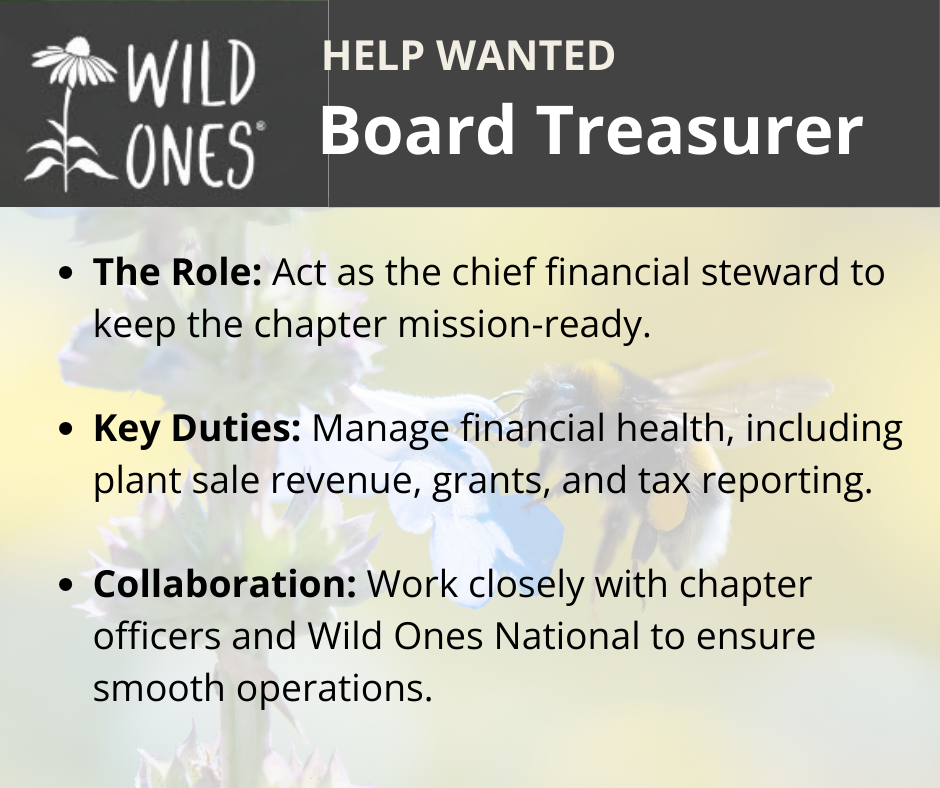 If numbers, organization, and transparency are your thing, the Treasurer is a vital leadership role that keeps Wild Ones DFW financially healthy and mission-ready. Serving as the chapter’s chief financial officer, this role supports everything from fundraising events, donations, grants, and plant sales to tax reporting and financial documentation—working closely with chapter officers, board members, and Wild Ones National to keep operations running smoothly and responsibly. The Treasurer is a principal officer, must be a current Wild Ones DFW member, and plays a collaborative part in making all our programming possible.